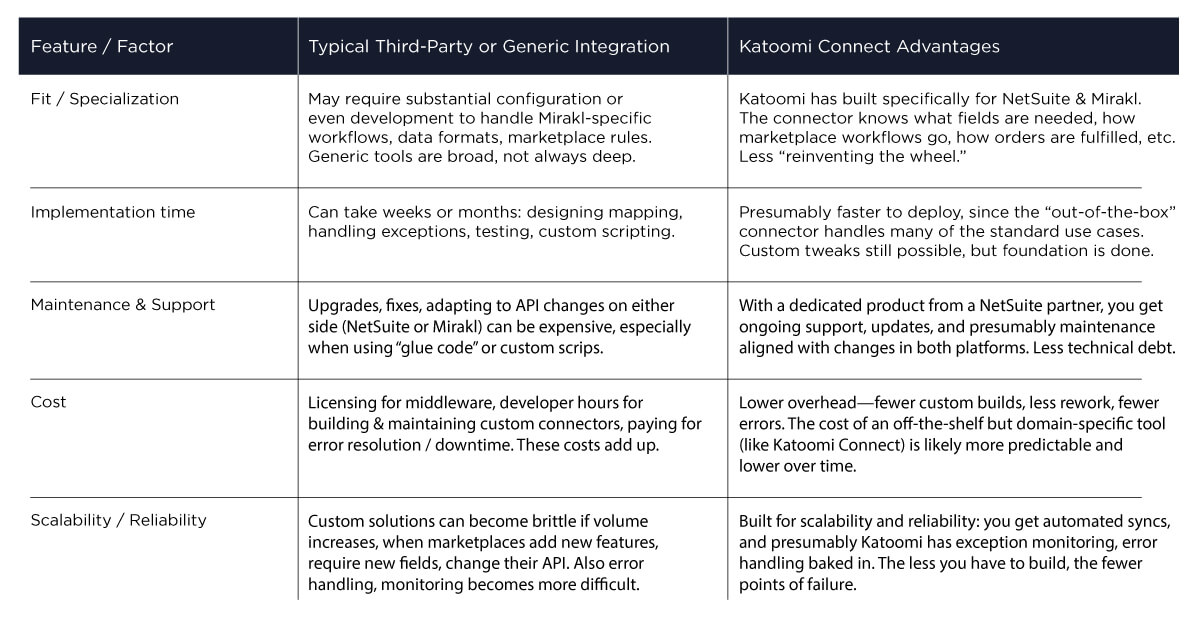Many businesses consider using middleware, custom integrations, or general iPaaS tools. Here’s how Katoomi Connect stacks up: